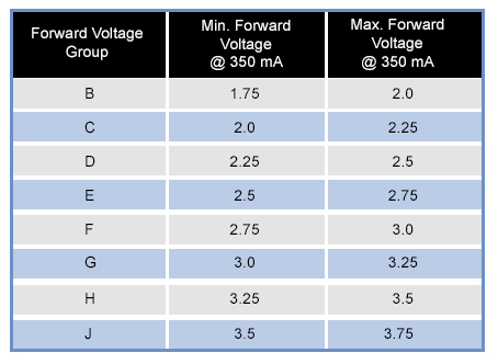 Forward voltage drop in LEDs varies from device to device and causes some issues. For example, the LED datasheet shows the forward voltage varies between 1.75 V and 3.75 V at 350 mA, - which is a significant variation. For minimum value (1.75 V), LEDs can work with a low-value series resistance at 3.3 V. However for the maximum value (3.75 V) sample, the LEDs will not even turn on. This issue is avoided by binning the LEDs according to forwarding voltage, and keeping the current constant. The following table shows the bin code for different forward voltages at 350 mA forward current: