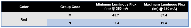 Luminous flux is the photometrically weighted radiant flux or power of light and is measured in lumen (lm). It differs from the measure of the total power of light emitted. The luminous flux takes into account varying sensitivity of the human eye to different wavelengths of light. One lumen is the luminous flux of light produced by an LED that emits 1 cd of luminous intensity over a 1 sr solid angle. In the datasheet, the luminous flux is represented in the table below. It indicates that at constant 350 mA forward current, a red LED of bin code M has a luminous flux in the range of 45.7 lm to 87.4 lm: