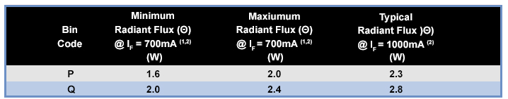 Radiant flux, or radiant power, is the radiometric parameter of an LED and is defined as the radiant energy emitted, reflected or transmitted per unit of time. It is measured in watts. In the datasheet, it is represented in the following table and indicates that, for a particular LED of bin code P at a constant forward current of, say, 700mA, the radiant power is 1.6W to 2.0W and, at 1000mA forward current, it is typically 2.3 W: