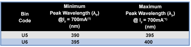 Peak wavelength is the single wavelength where the radiometric emission spectrum of the LED reaches its maximum. It does not represent any apparent emission of the light source, as perceived by the human eye, but, rather, by photo-detectors. In the datasheet, it is represented in the following table, where an LED of bin code U5 has the peak wavelength 390 nm to 395 nm at a constant forward current of 700 mA: