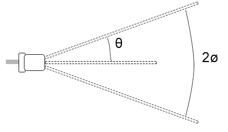 Dominant wavelength is the single wavelength observed by the human eye. Normally, one light source involves multiple wavelength spectrums rather than a single wavelength. When we look at the light, our brains observe those multiple spectrums as a single color of light with a single specific wavelength. If the LED is used to illuminate or indicate something for human operators, we should consider the dominant wavelength for an LED selection. - Viewing Angle (FWHM) Viewing angle is the maximum angle at which we can view the display with an acceptable visual performance. The LED industry defines a viewing angle as the full angle at which brightness is half of the brightness from the dead center. If ø is the angle from off center (0°) where the LED’s brightness is half, then 2ø is defined as the full viewing angle. In the datasheet, it is denoted by Full-Width Half Maximum (FWHM).